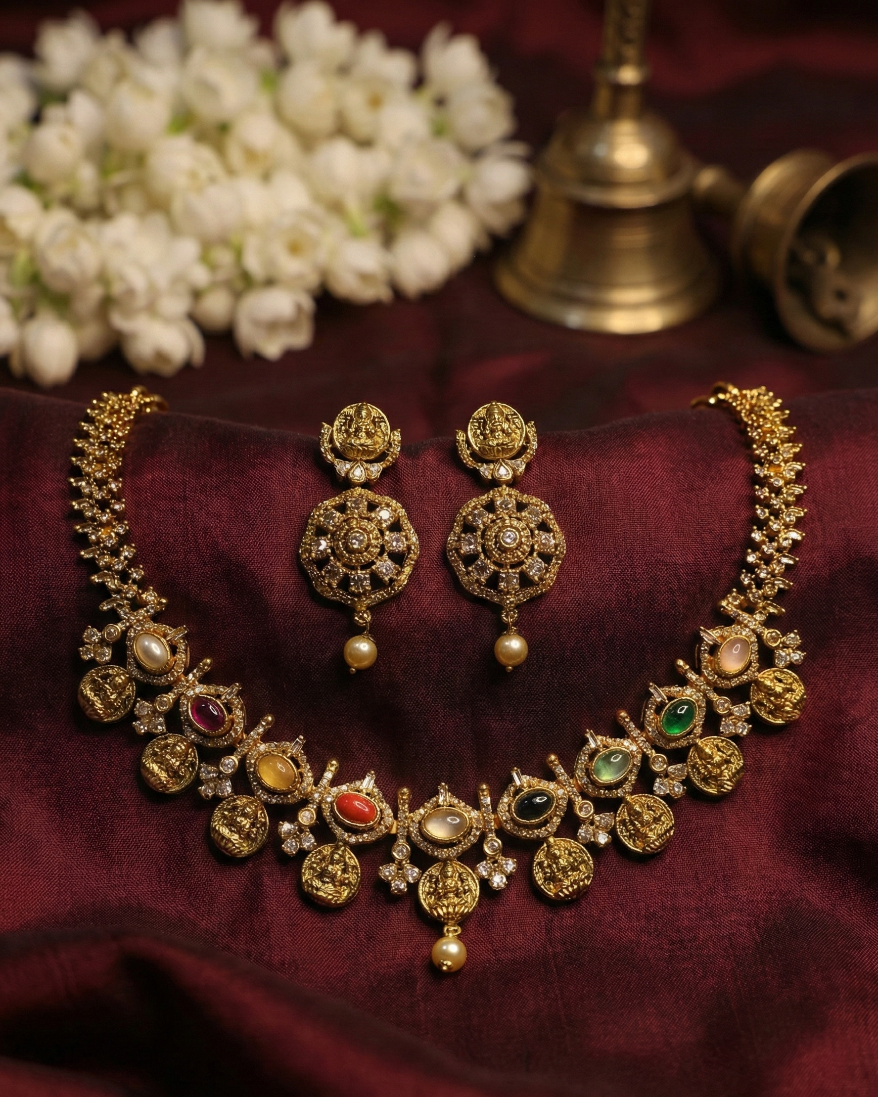Aishwarya Ratnamala is a premium South Indian temple jewellery necklace set inspired by the divine symbolism of Navaratna gemstones and the blessings of Goddess Lakshmi, the embodiment of prosperity and abundance. Crafted in a rich antique gold finish, this elegant temple necklace features intricately detailed coin motifs, traditional deity engravings, and carefully placed multicolour stones that represent balance, protection, and auspicious energy.