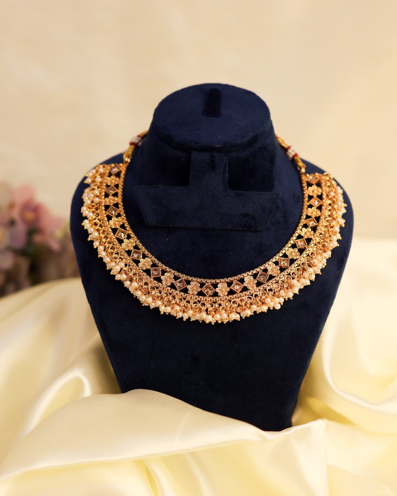 Every detail is designed to be skin-safe and feather-light, so you can wear it for hours and feel nothing but elegance. Pearls and kundan sparkle together like droplets of moonlight, making this necklace not just jewellery — but a poetic ode to radiance.