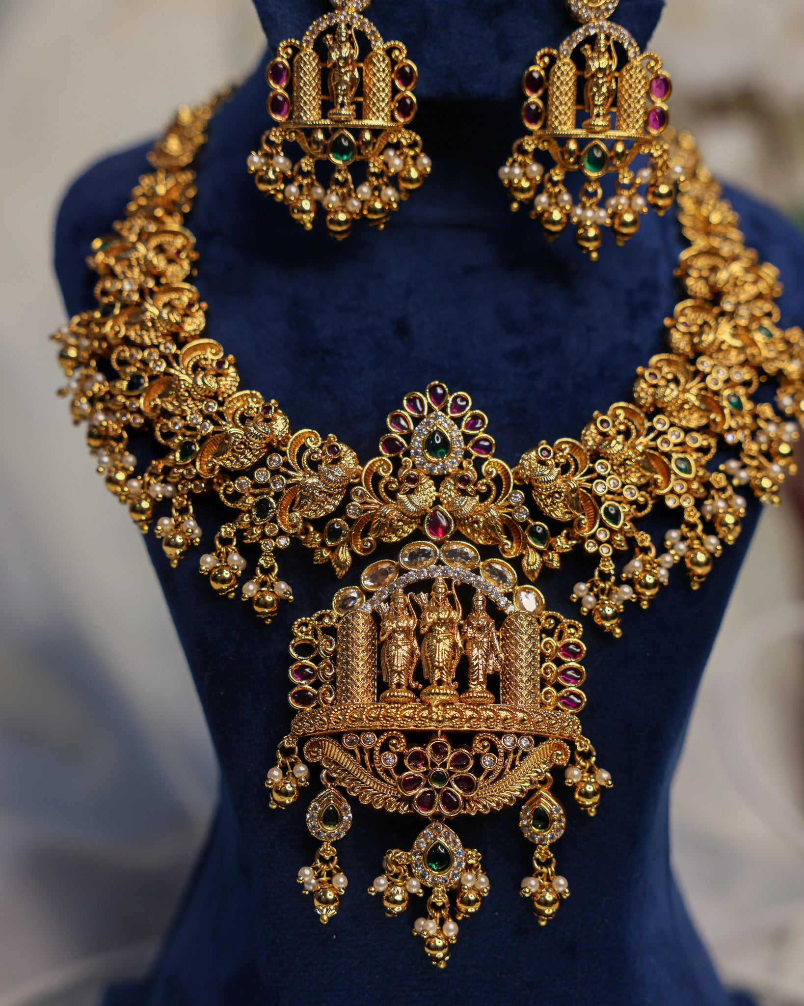 Kalyana Rama Haaram is a premium South Indian temple jewellery necklace set inspired by the sacred symbolism of Rama–Sita Kalyanam, representing dharma, devotion, and auspicious union. Crafted in a rich antique gold finish, this grand temple haaram features an intricately sculpted central deity panel, traditional temple motifs, ruby and emerald-toned stones, and delicate pearl embellishments that echo timeless craftsmanship.