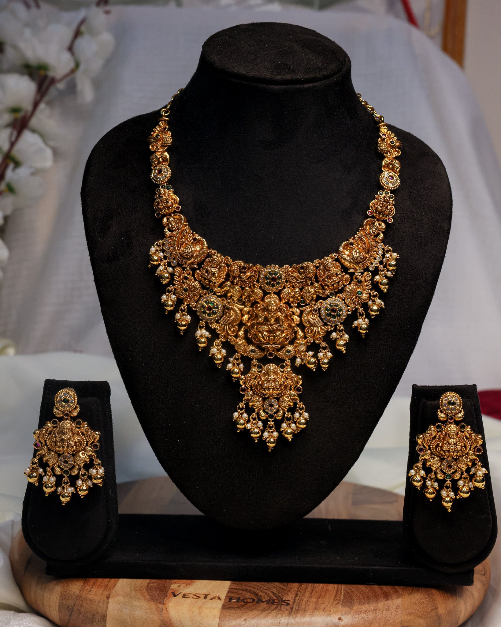 Designed for women who value devotion and tradition, Lakshmi Anugraham is ideal for bridal wear, weddings, poojas, festivals, and auspicious occasions. The balanced composition and sacred detailing evoke a sense of spiritual connection while maintaining royal elegance. The matching temple earrings complete the set, making it a meaningful adornment for sacred moments.