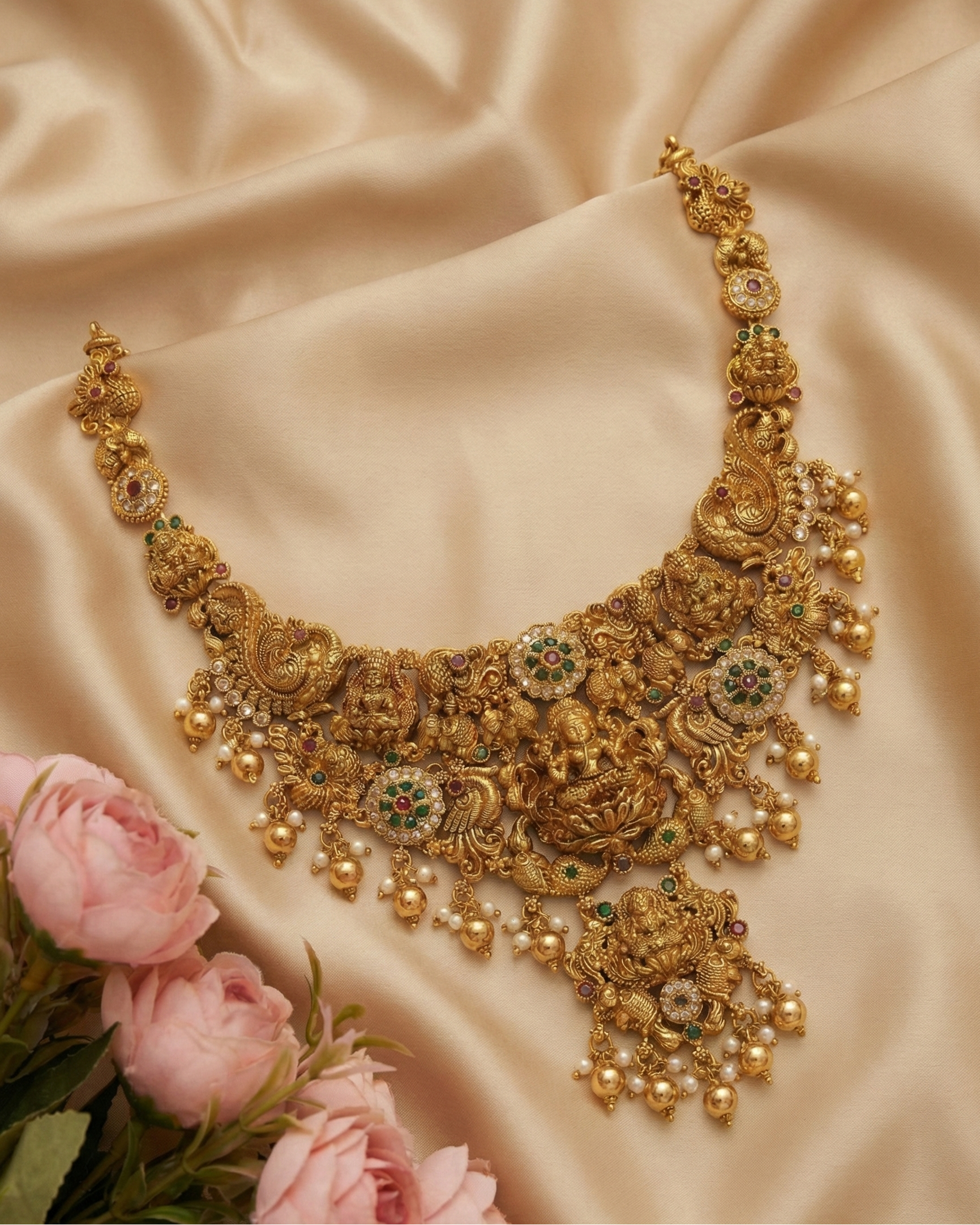 Lakshmi Anugraham is a premium South Indian temple jewellery necklace set inspired by the divine blessings of Goddess Lakshmi, symbolising prosperity, well-being, and eternal grace. Crafted in an antique gold finish, this elegant temple necklace showcases intricately sculpted deity motifs, traditional temple carvings, rich ruby and emerald-toned stones, and delicate pearl accents that reflect the depth of South Indian heritage craftsmanship.