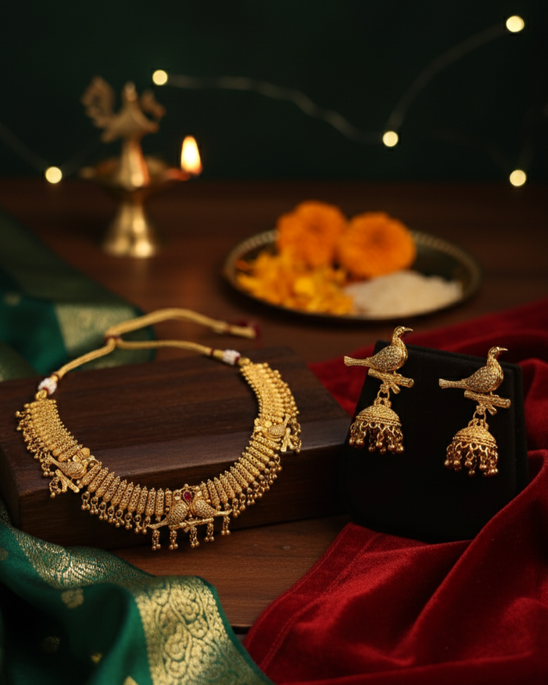 Suwarnikaa’s Divine Parrot Choker is where heritage flirts with high fashion. Two golden parrots sit like regal besties, studded with stones that scream luxury, while the playful danglings dance with every move. Made with brass and finished to premium perfection, this choker is as extra as your vibe this choker is bold, flamboyant, and soaked in royal glam.