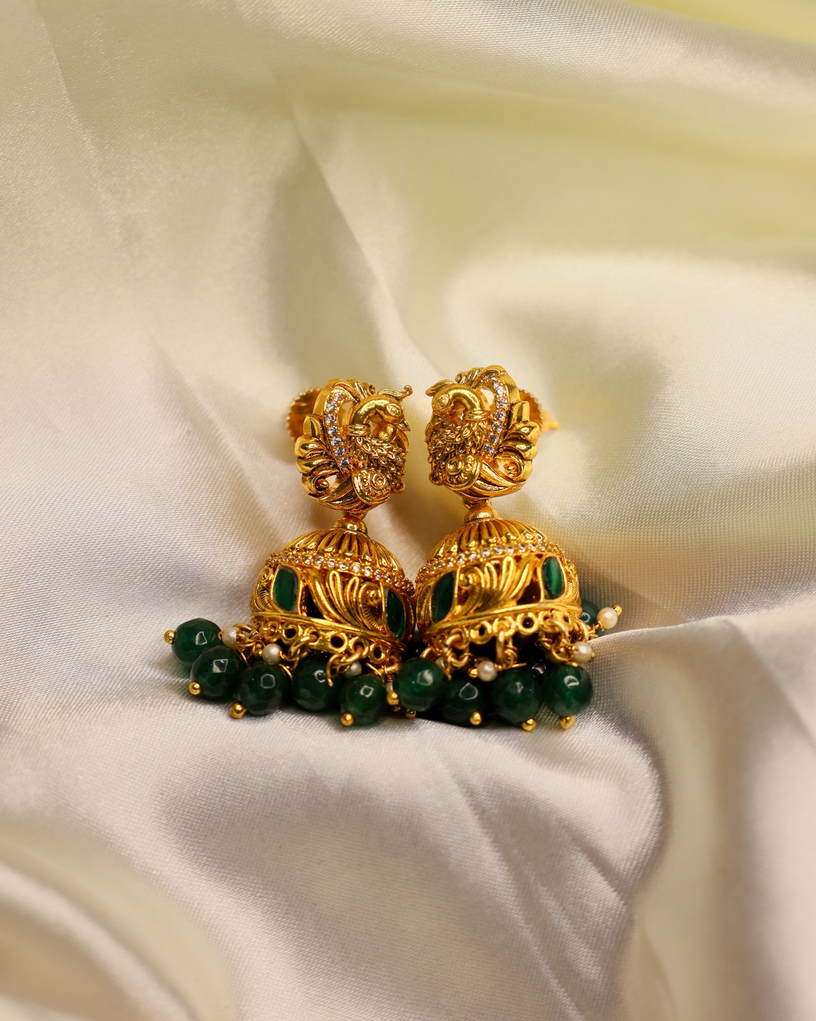 Designed with intricately sculpted peacock motifs at the top, the jhumkalu flow into richly detailed dome forms highlighted with Emareld-toned accents. The graceful pearl and ruby bead drops add movement and depth, enhancing the luxurious antique gold finish.