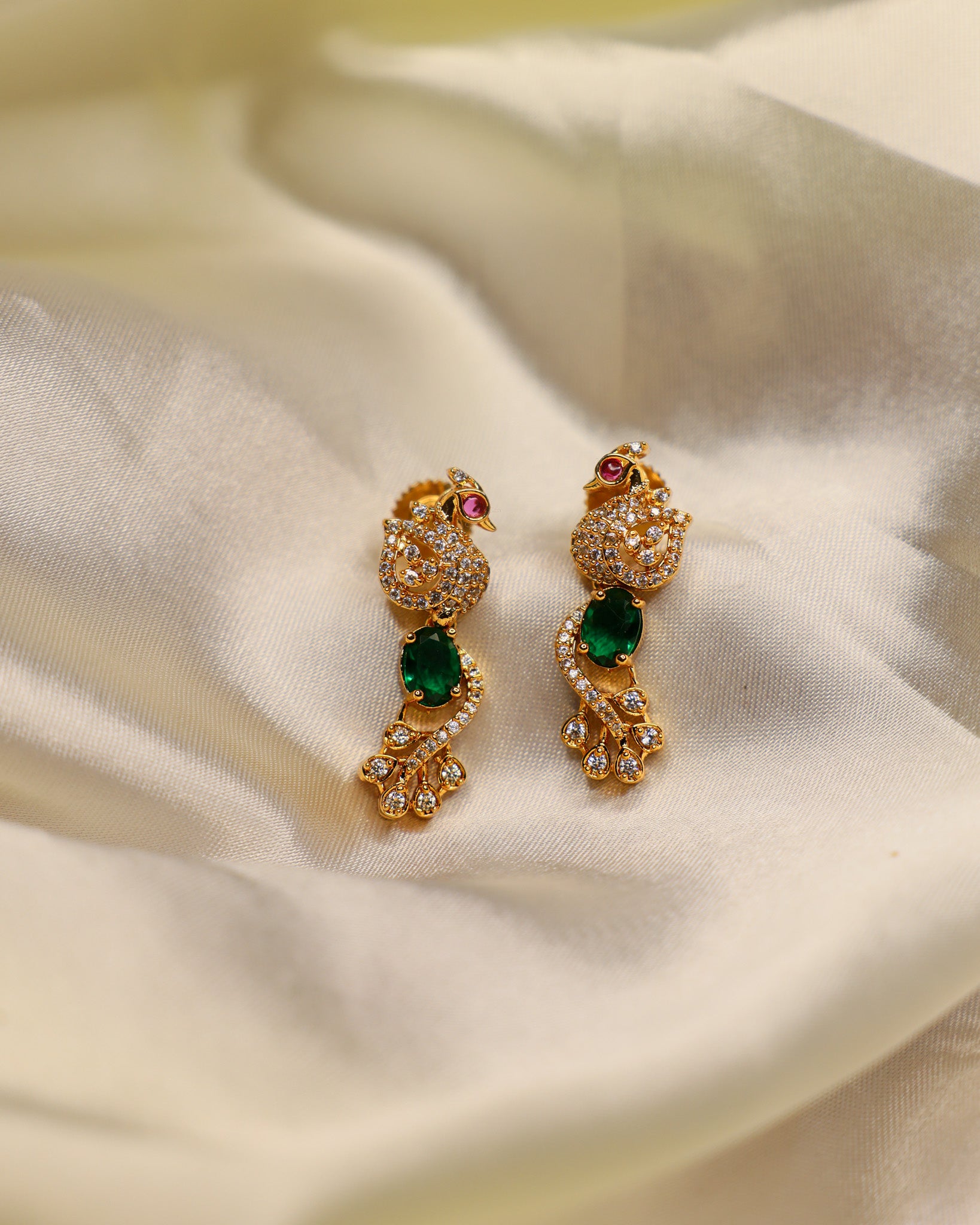 Crafted in a rich antique gold finish, the design features a graceful peacock-inspired silhouette highlighted with a vibrant Emerald -toned stone and finely set crystal detailing. The compact yet expressive form makes these studs perfect for adding a subtle festive glow without overpowering the look.