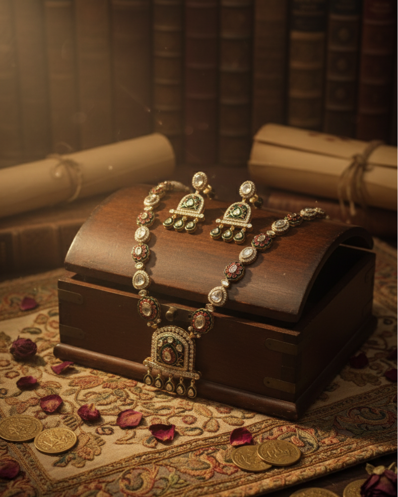 💍 Premium Imitation Jewelry – combining natural metals, moissanite brilliance, kundan craftsmanship, and handmade kalamkari art for an heirloom-worthy treasure.