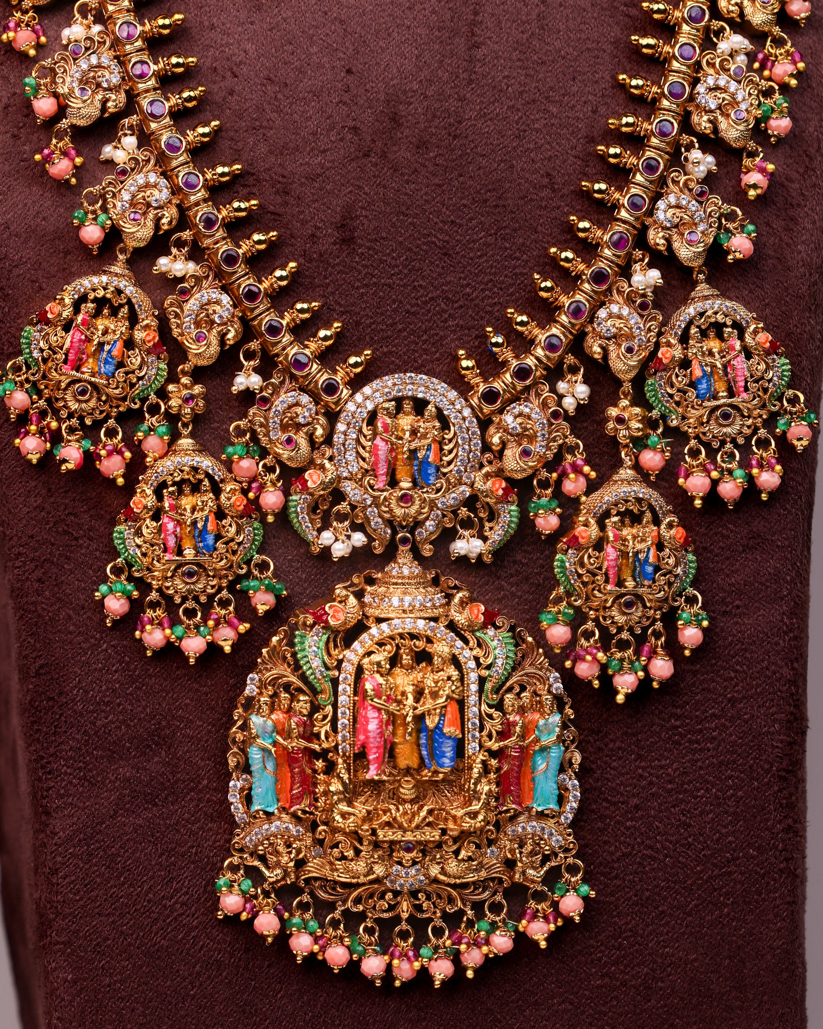 Expertly crafted by Suwarnikaa Jewels, this set is designed to mirror the intricate detailing of original handmade gold heritage pieces. The central pendant features a vivid, colorful depiction of the celestial wedding, surrounded by premium antique gold finishing that exudes royalty.