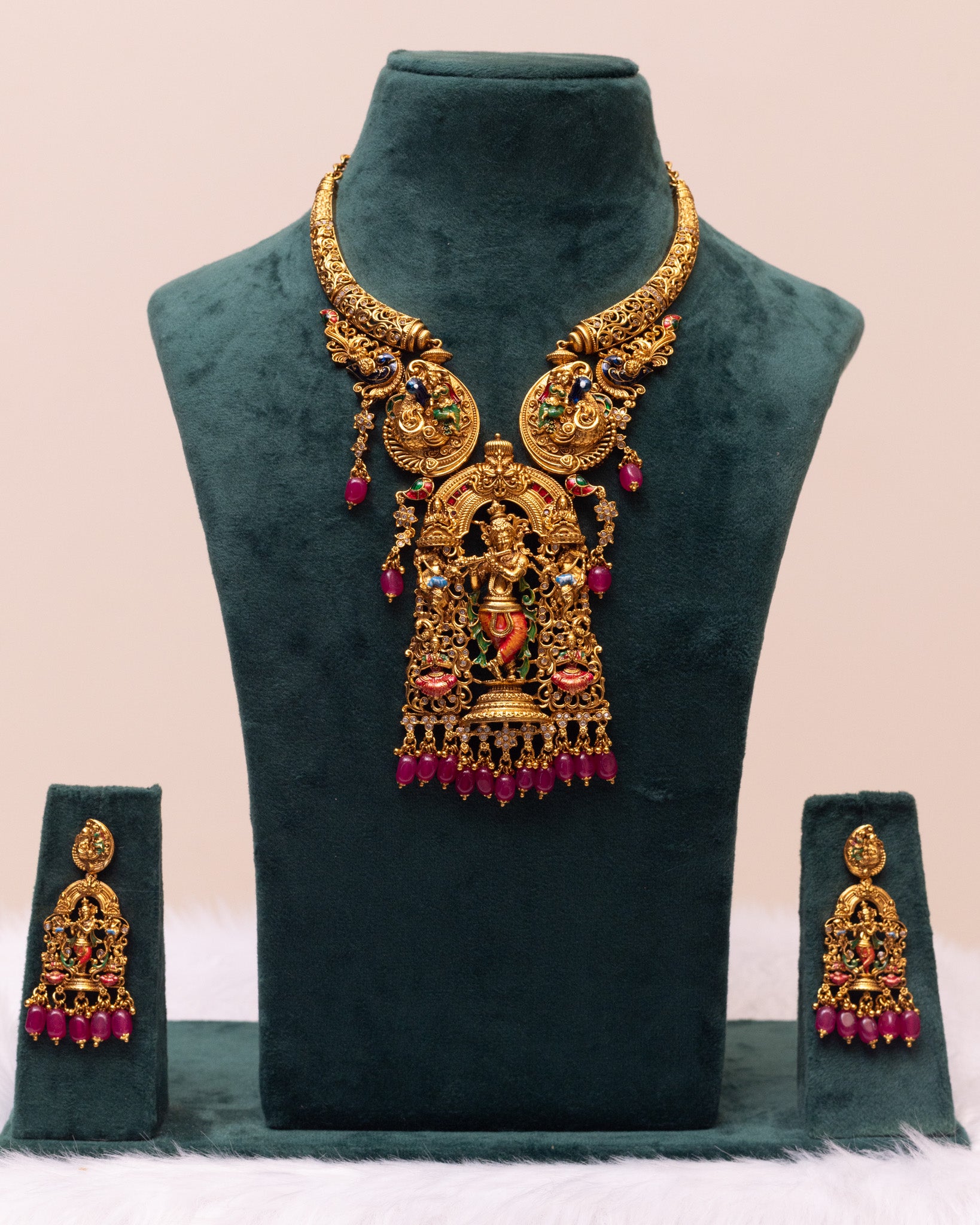 The centerpiece is a triumph of artistry, featuring intricate Nakshi carving of Krishna framed by a majestic arch and flanked by royal peacocks. Cascading beneath the pendant are rich, ruby-red semi-precious beads that add a vibrant contrast to the antique gold finish.