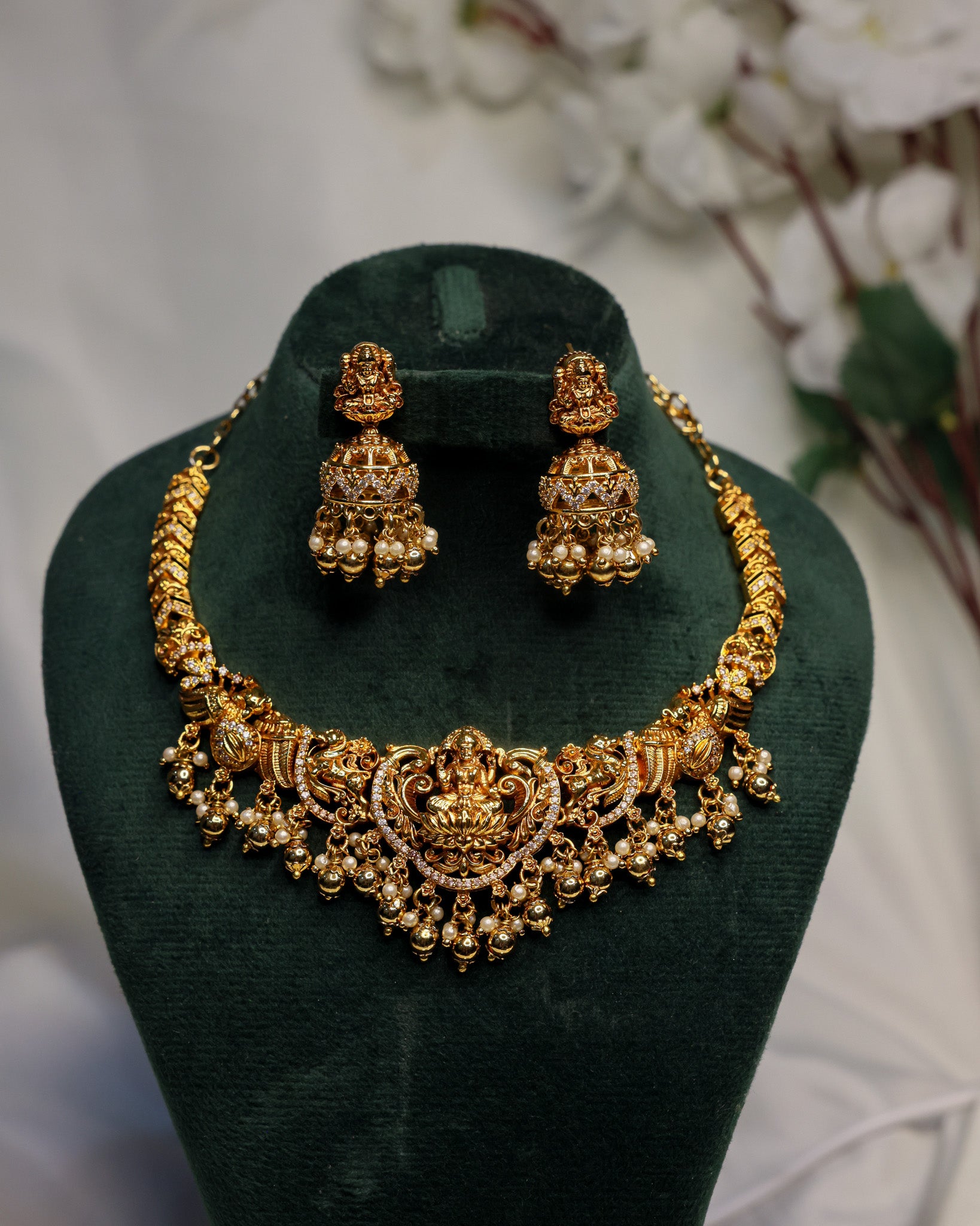 The necklace is adorned with intricate traditional detailing and finished with delicate pearl drops that sway gracefully with every movement. Matching jhumka earrings complement the design, reflecting the same craftsmanship and devotional elegance.