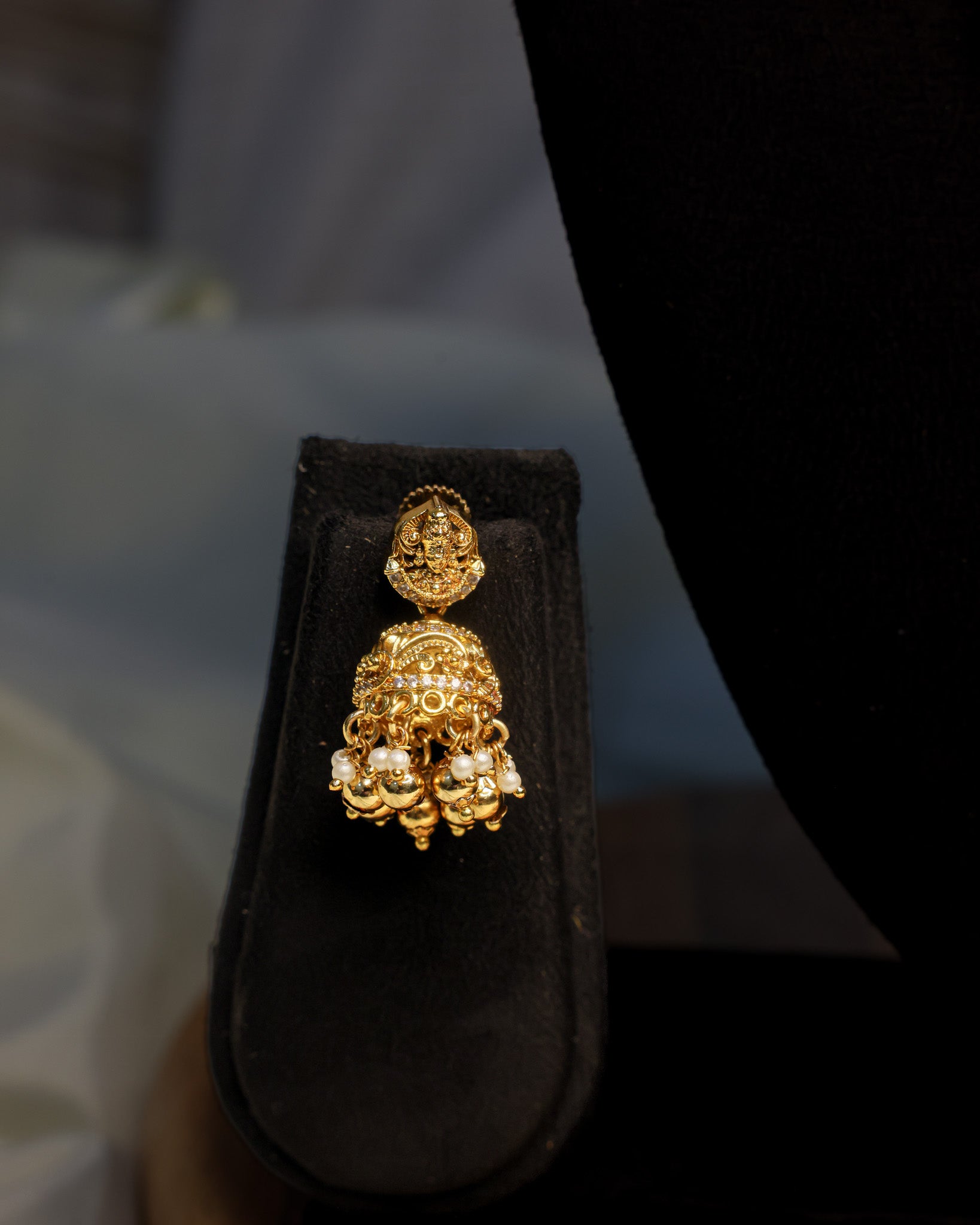 At the heart of this temple jewellery haaram rests an exquisitely detailed Sri Srinivasa idol, symbolizing Anugraham (divine blessings) and spiritual abundance. The antique gold finish, intricate temple motifs, and delicate pearl hangings reflect the grandeur of traditional South Indian craftsmanship passed down through generations.