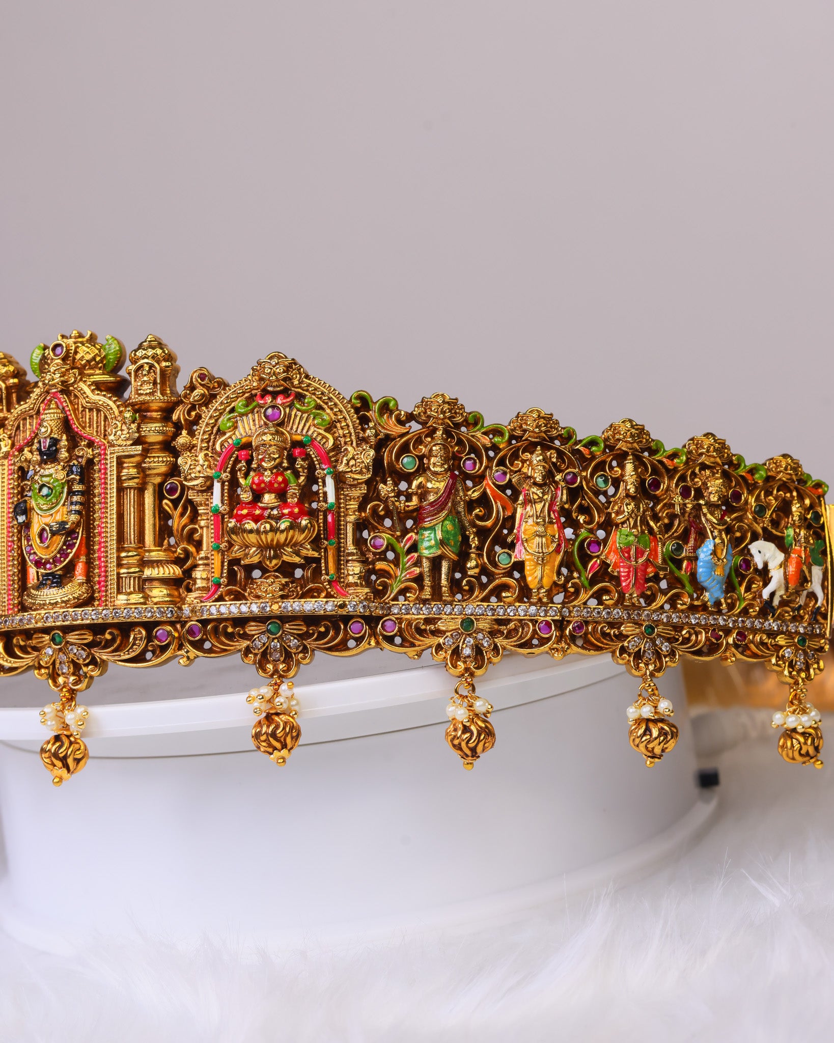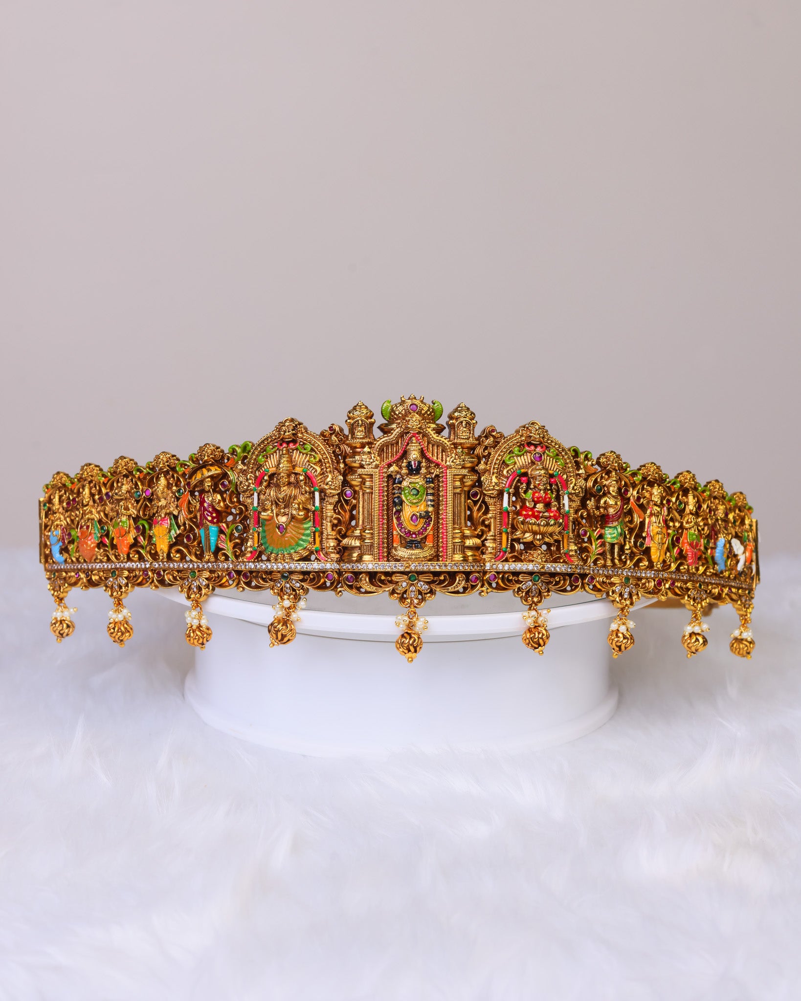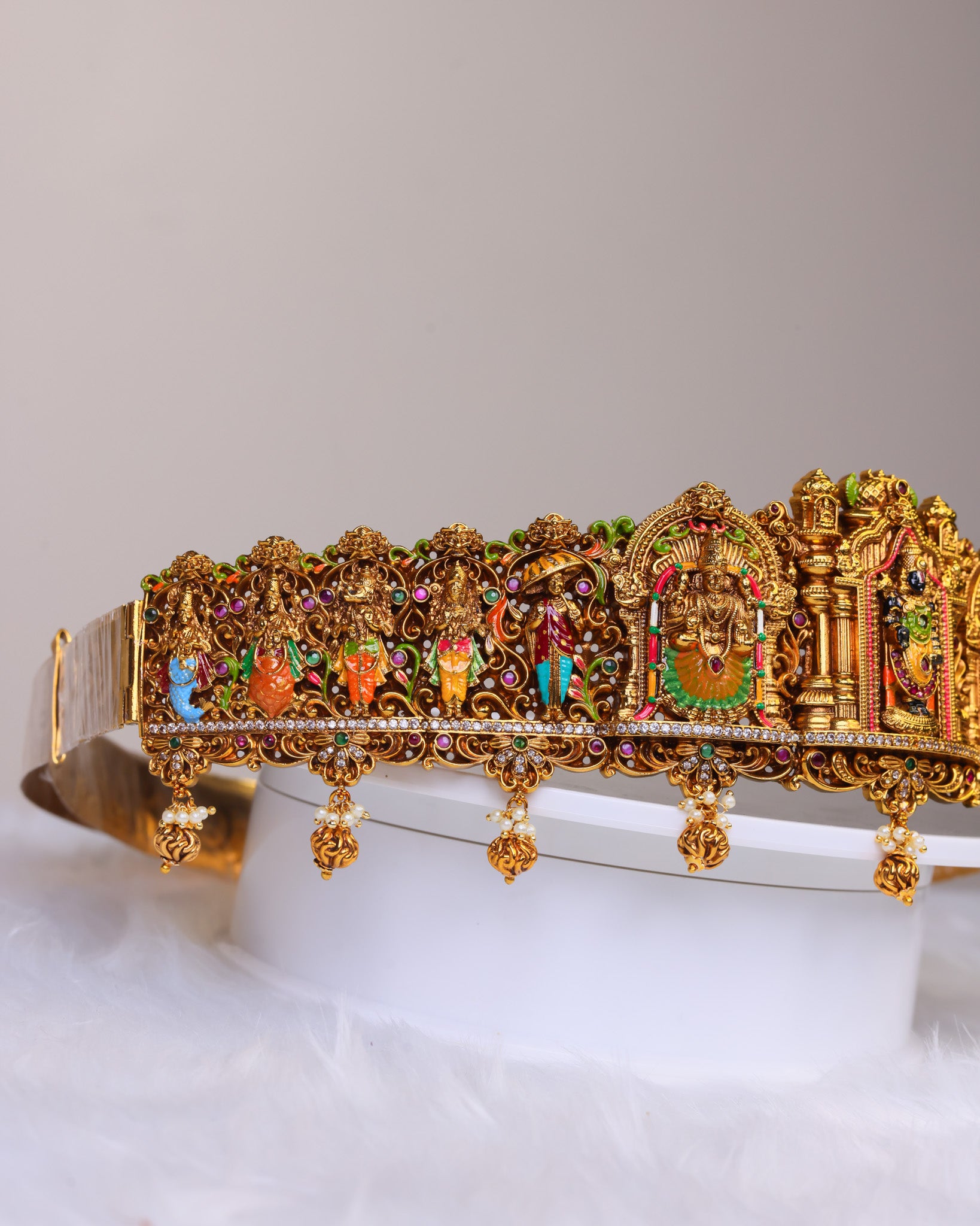 Designed with a majestic temple sanctum centerpiece, surrounded by intricately sculpted Dashavatara panels, this vaddanam reflects the spiritual grandeur of Vaikuntha itself. The elaborate gopura-inspired carvings, detailed deity figures, and vibrant meenakari artistry elevate its presence into a true bridal heirloom.