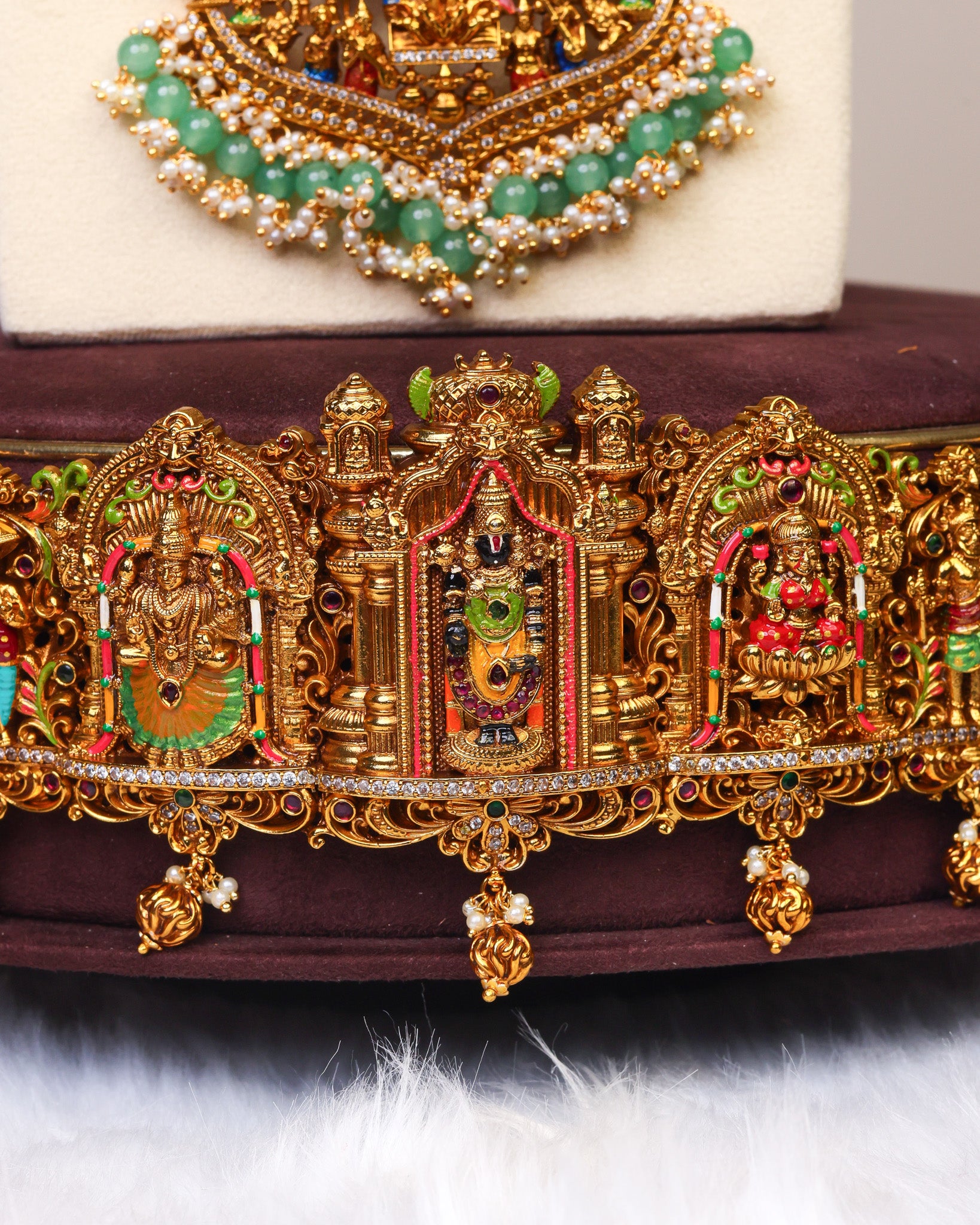 • Statement temple vaddanam (waist belt) with divine figurine detailing