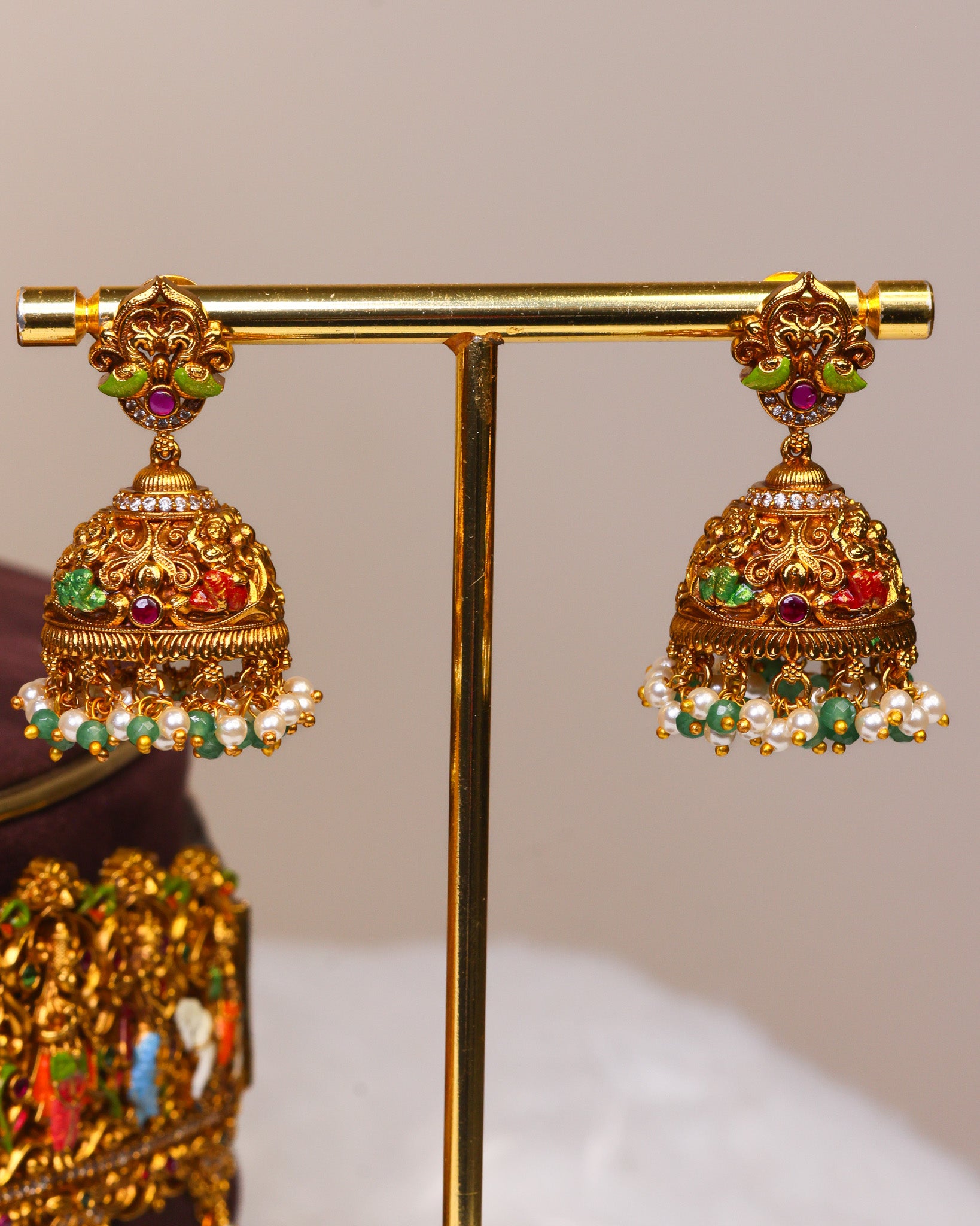 • Intricately carved choker with elegant pearl & emerald bead drops