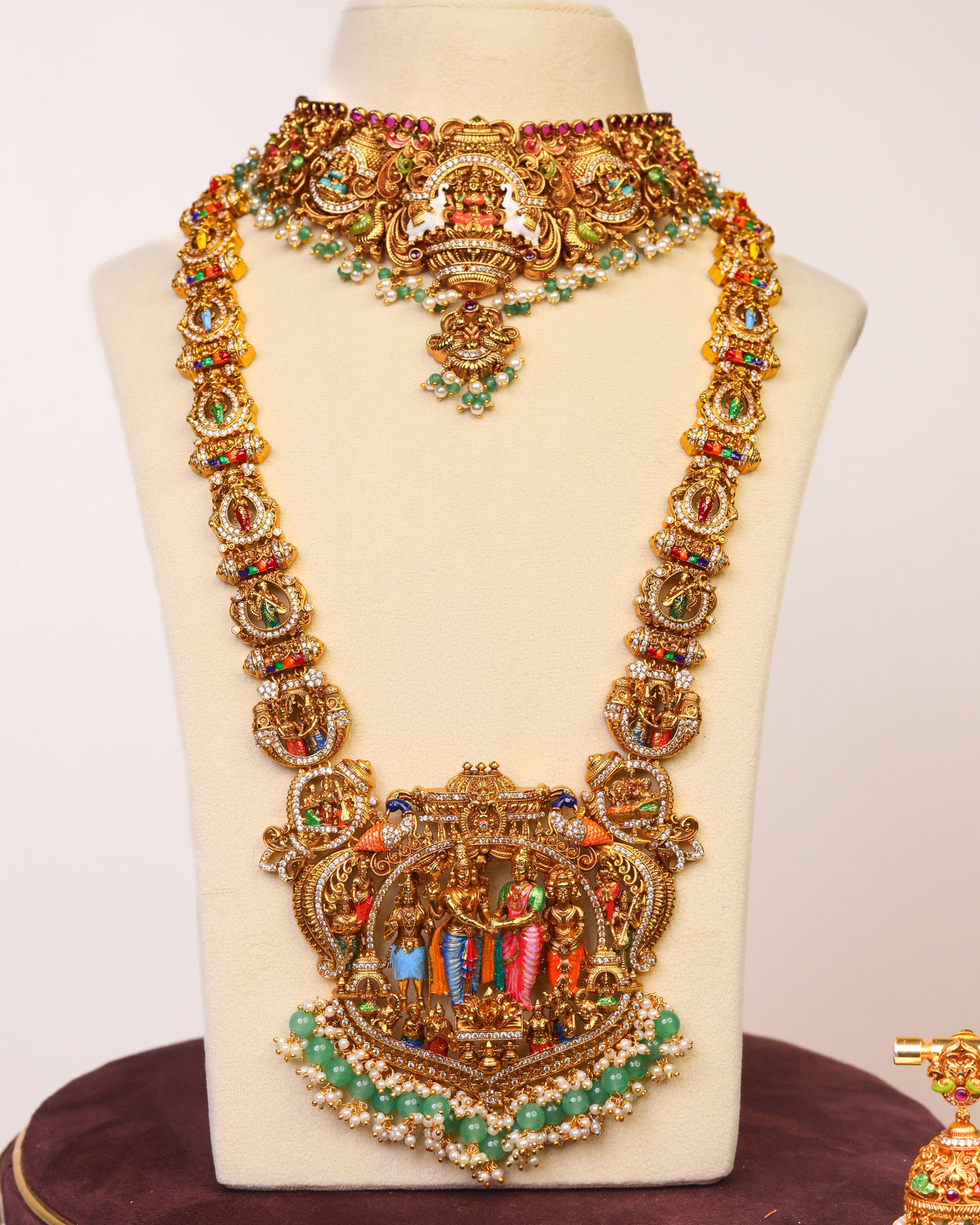 • Grand multi-layered long haram with detailed Srinivasa Kalyanam motif pendant
