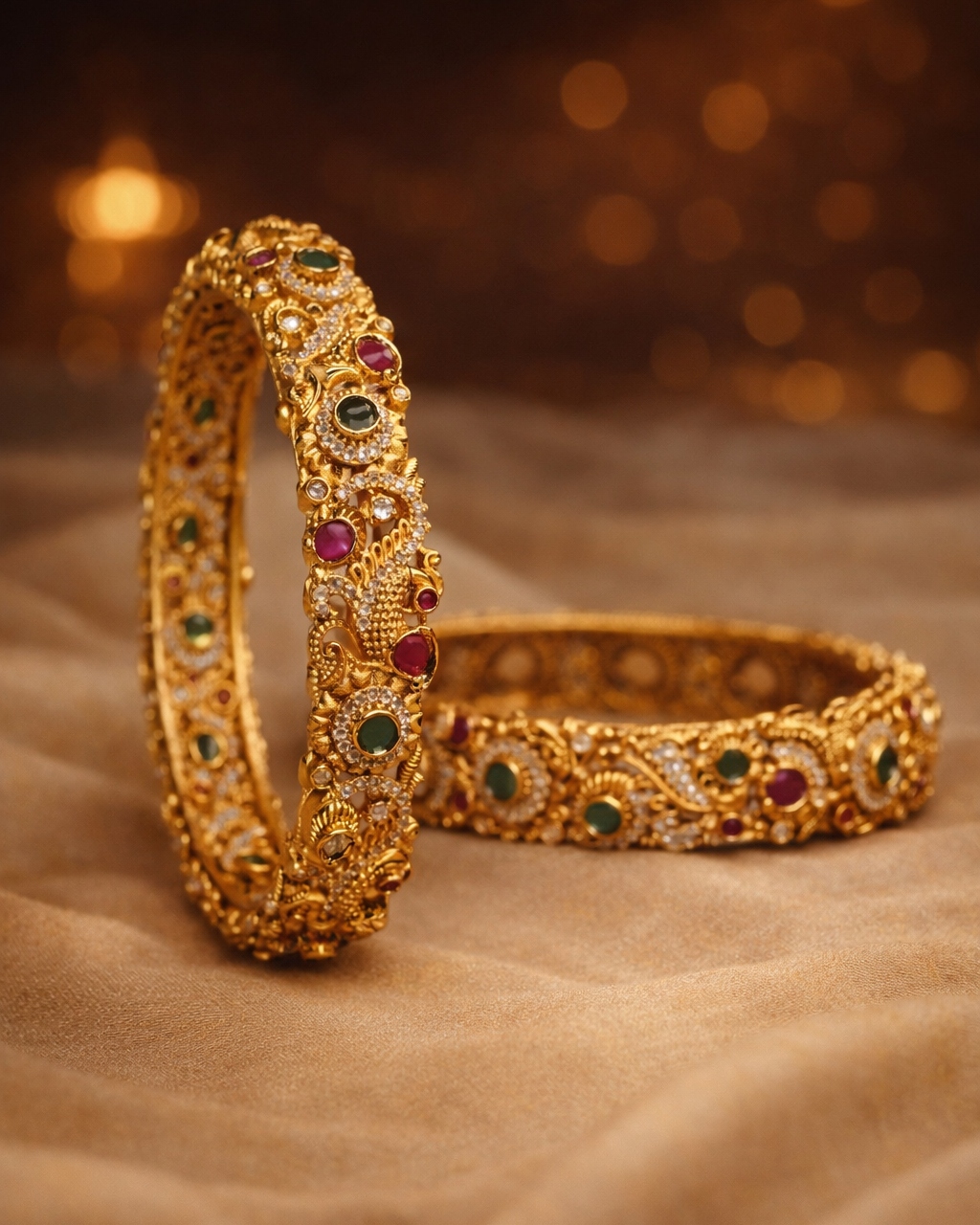Expertly crafted with intricate detailing, these bangles feature rich ruby and emerald stone embellishments, refined granulated gold bead work, and elegant temple-inspired carvings that highlight traditional craftsmanship. The harmonious placement of gemstones enhances the visual depth and brilliance of the design, creating a luxurious and regal appeal.