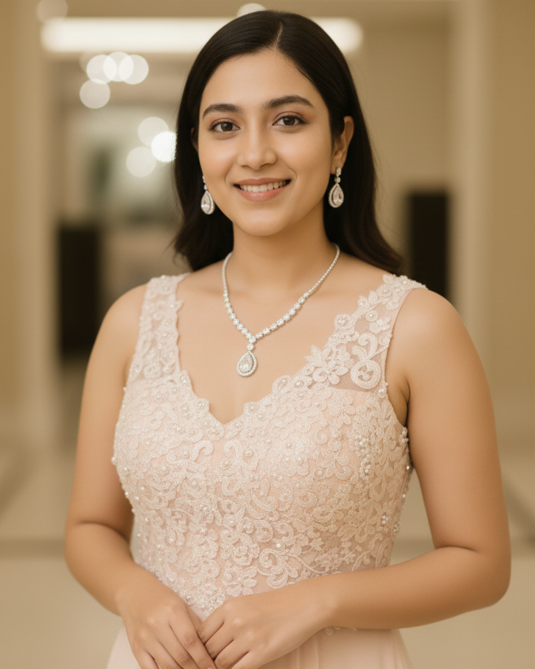 Suwarnikaa’s Diamond Drizzle Necklace Set – A dazzling cascade of brilliance, crafted in brass with premium silver plating. The teardrop crystals shimmer like raindrops of light, making this lightweight, skin-safe set the perfect blend of elegance and modern luxury.