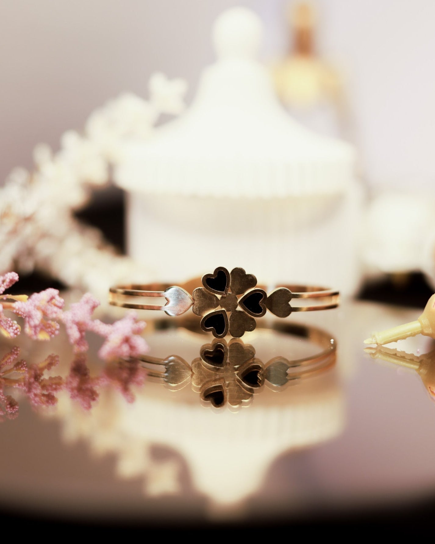 Shine with Suwarnikaa’s Heart Clover Bracelet — a gold-polished stainless-steel beauty blending four tiny black hearts into a lucky clover of love and elegance.