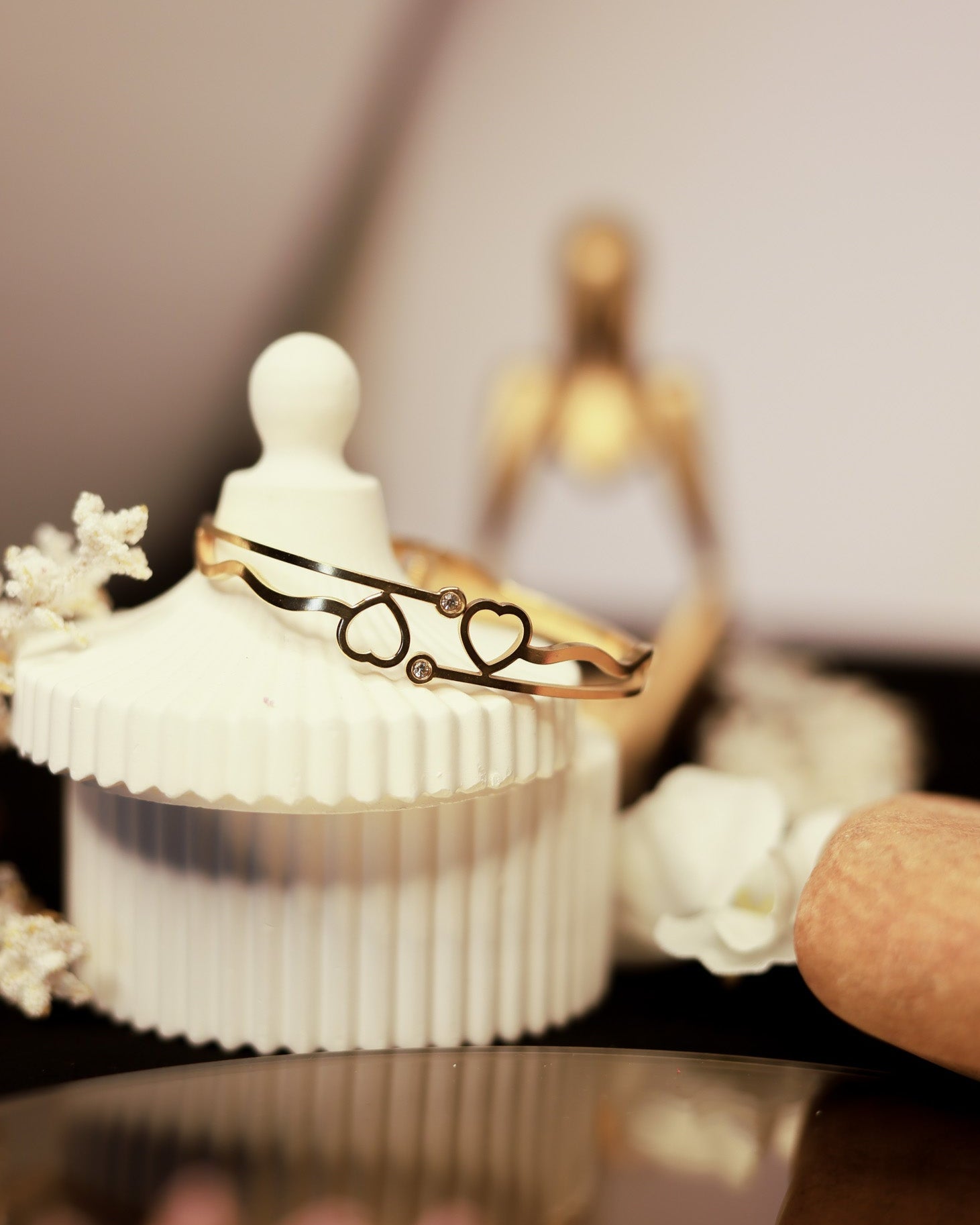 Celebrate love with Suwarnikaa’s Twin Hearts Bracelet — a gold-polished stainless-steel design featuring two open hearts and sparkling stones that capture pure romantic elegance.