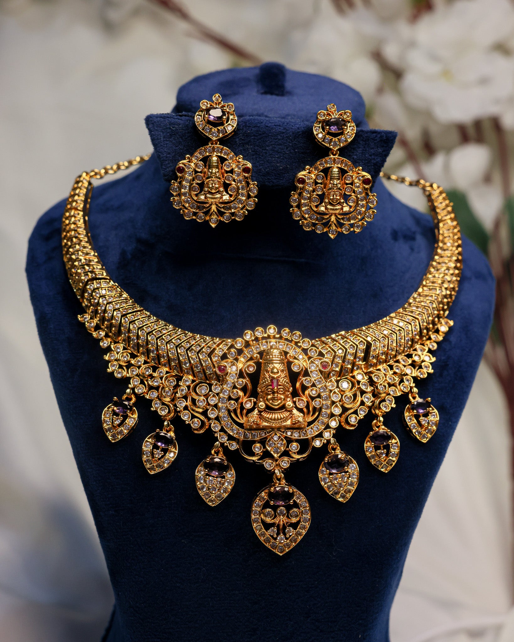 Vaikunta Kanti is a premium South Indian temple jewellery necklace set, inspired by the divine radiance of Lord Venkateswara and the sacred grandeur of Tirumala temple traditions. Crafted in rich antique gold finish, this exquisite necklace features an intricately carved central deity motif surrounded by traditional temple patterns, kundan-style stone detailing, and graceful dangling elements that reflect heritage elegance.